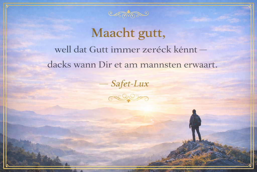 🇱🇺„De positive Gedanke ass eng Kraaft, déi de Mënsch duerch all Erausfuerderunge vum Liewen féiert , оch an de schwieregste Momenter gëtt et ëmmer eng kleng Spur vu Liicht, déi de Wee zur Sonn weist – fir um Enn dech selwer ze beliichten an och all déi ronderëm dech.“ (Safet Alili)